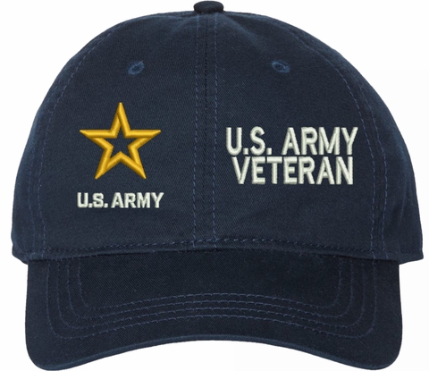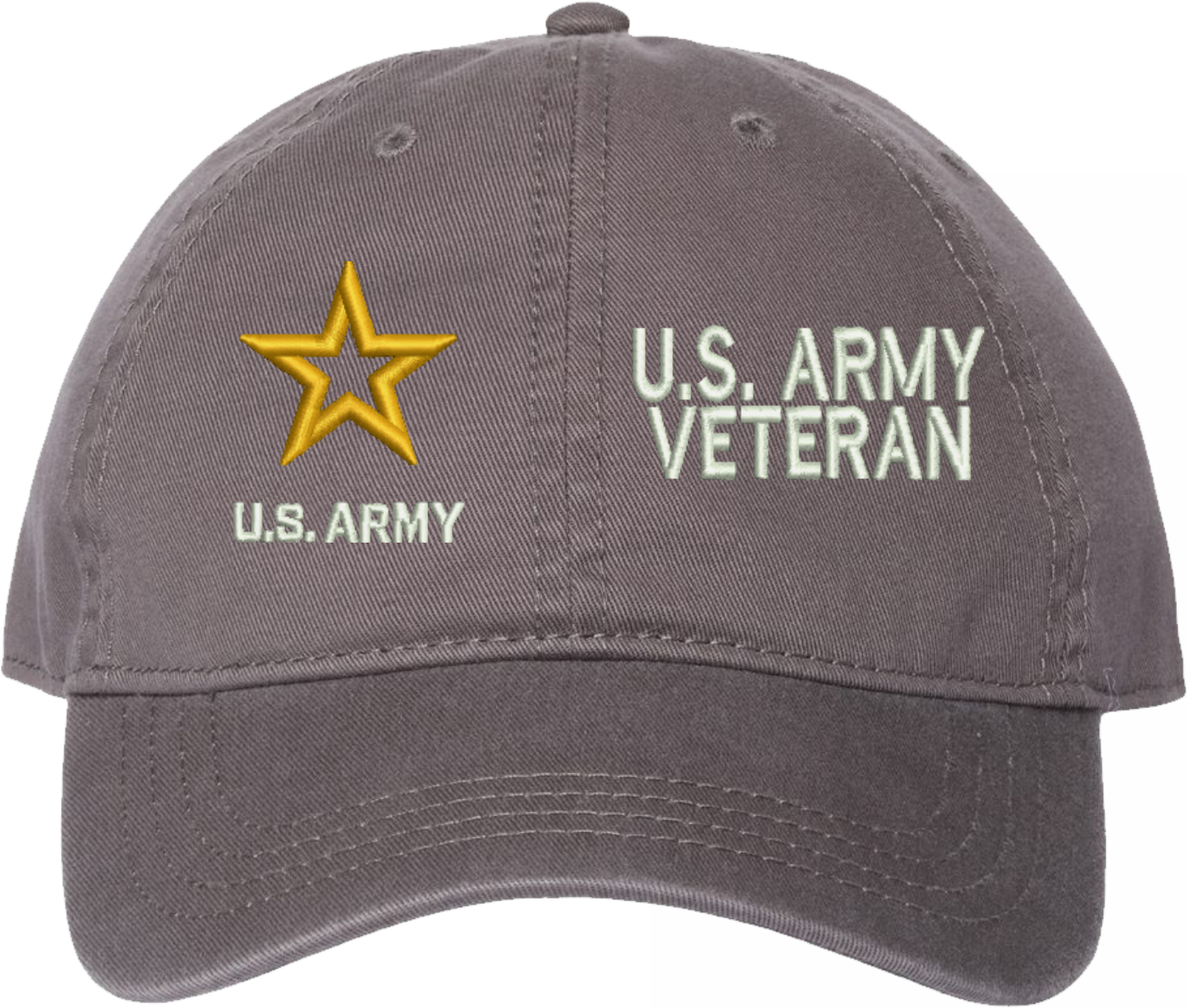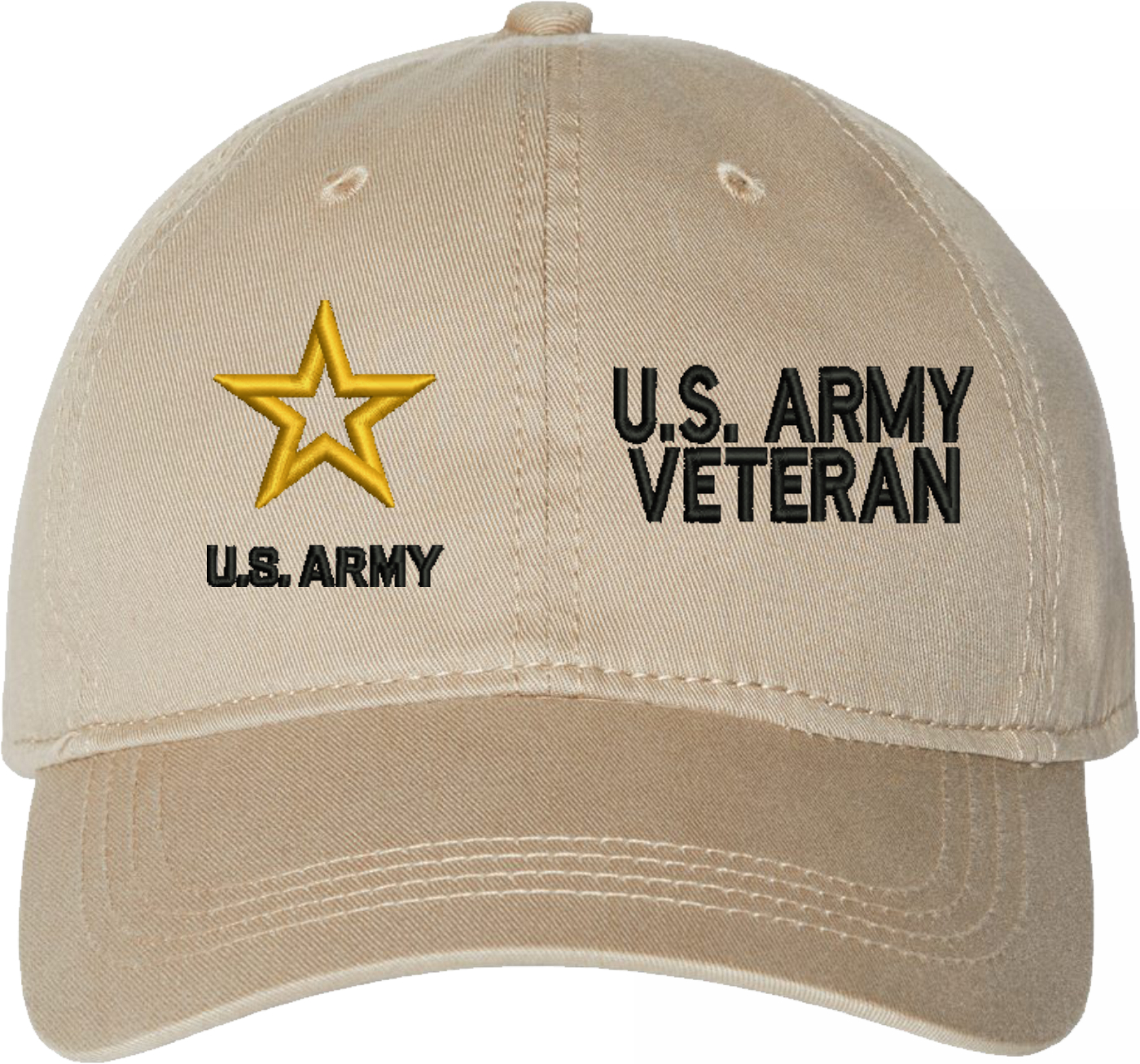 Show your Army pride with this U. S. Army Veteran Unstructured Dad Cap from MilitaryBest. Crafted from 100% washed chino twill cotton, this six-panel, low-profile cap offers a relaxed and comfortable fit. Featuring high-quality embroidery done in our Scottsboro, Alabama facility, this cap is designed with a pre-curved visor and an adjustable tri-glide buckle closure for a perfect fit. Whether for everyday wear or as a meaningful gift, this cap is a great way to honor your own or a loved one's service.For caps ordered with custom embroidered personalized text please allow an additional 3 to 5 days production time. All custom back text will be embroidered in ALL CAPITAL LETTERS. Caps with back text or eggs are non-returnable unless there is a material defect in the cap.