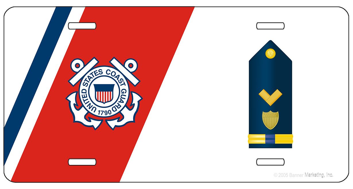 This U.S. Coast Guard Chief Warrant Officer 4 License Plate is made from heavy gauge aluminum and has a baked enamel finish to last for many years of use. Each plate measures 5 15/16" x 11 15/16". This license plate would make a wonderful addition to your collection or a great gift.