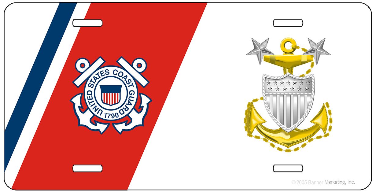 This U.S. Coast Guard Master Chief Petty Officer License Plate is made from heavy gauge aluminum and has a baked enamel finish to last for many years of use. Each plate measures 5 15/16" x 11 15/16". This license plate would make a wonderful addition to your collection or a great gift.