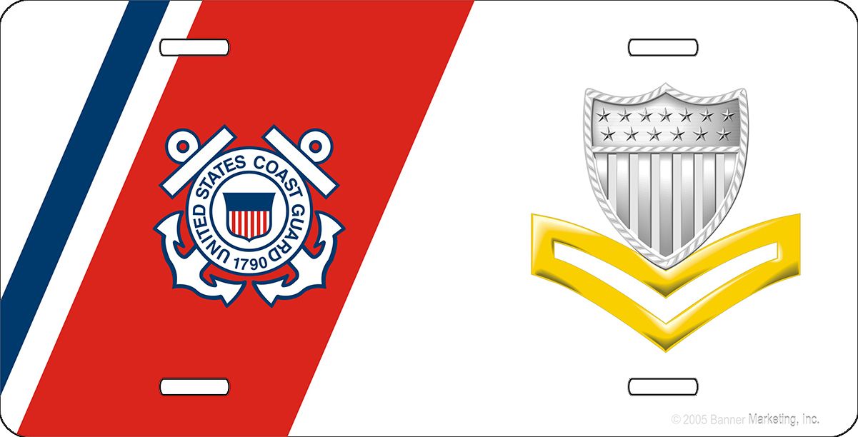 This U.S. Coast Guard Second Class Petty Officer License Plate is made from heavy gauge aluminum and has a baked enamel finish to last for many years of use. Each plate measures 5 15/16" x 11 15/16". This license plate would make a wonderful addition to your collection or a great gift.