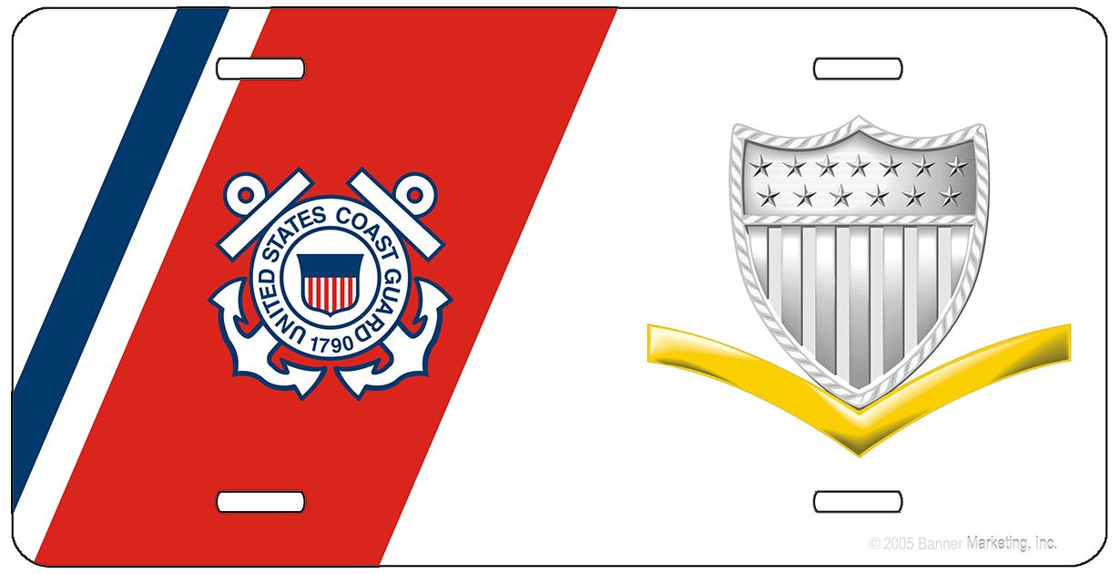 This U.S. Coast Guard Third Class Petty Officer License Plate is made from heavy gauge aluminum and has a baked enamel finish to last for many years of use. Each plate measures 5 15/16" x 11 15/16". This license plate would make a wonderful addition to your collection or a great gift.