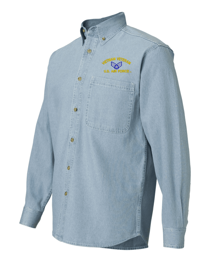 We are proud to offer these custom embroidered U.S. Air Force Denim Long Sleeve Shirts and each is directly embroidered in the USA! Select your desired color, insignia and text on our order form above.