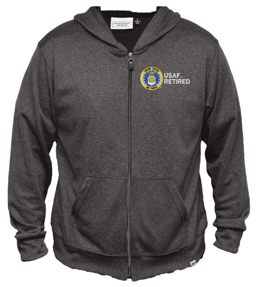 MilitaryBest proudly offers this top-quality U.S.A.F Retired Men's 100% Polyester Heather Grey Full-Zip Hoodie. We have proudly partnered with Authentically American to offer you this Made in the USA Hoodie. Water & wrinkle resistance make this zip hoodie the perfect layering piece from the golf course to you favorite travel destination.As with all MilitaryBest items, our designs are Officially Licensed. A percentage of the sale of each MilitaryBest item is forwarded to the licensing department in support of it's MWR (Morale, Welfare, & Recreation) program. These payments are made by either ALL4U LLC or the wholesaler from where the item originated. Our team thanks you for your service and your support of these programs.