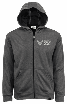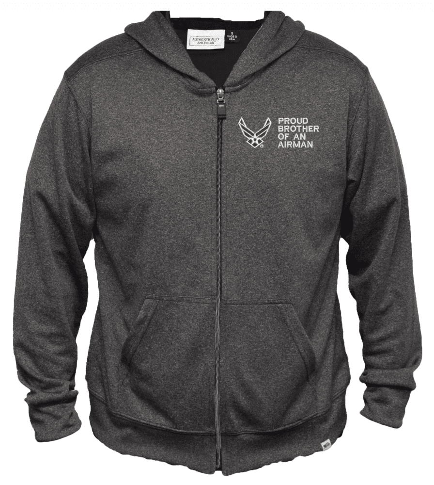 MilitaryBest proudly offers this top-quality Proud Brother of an Airman U.S. Air Force Men's 100% Polyester Heather Grey Full-Zip Hoodie. We have proudly partnered with Authentically American to offer you this Made in the USA Hoodie. Water & wrinkle resistance make this zip hoodie the perfect layering piece from the golf course to you favorite travel destination.As with all MilitaryBest items, our designs are Officially Licensed. A percentage of the sale of each MilitaryBest item is forwarded to the licensing department in support of it's MWR (Morale, Welfare, & Recreation) program. These payments are made by either ALL4U LLC or the wholesaler from where the item originated. Our team thanks you for your service and your support of these programs.