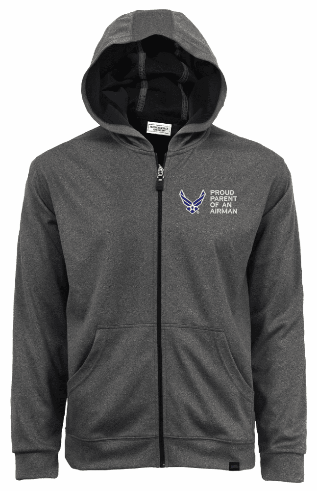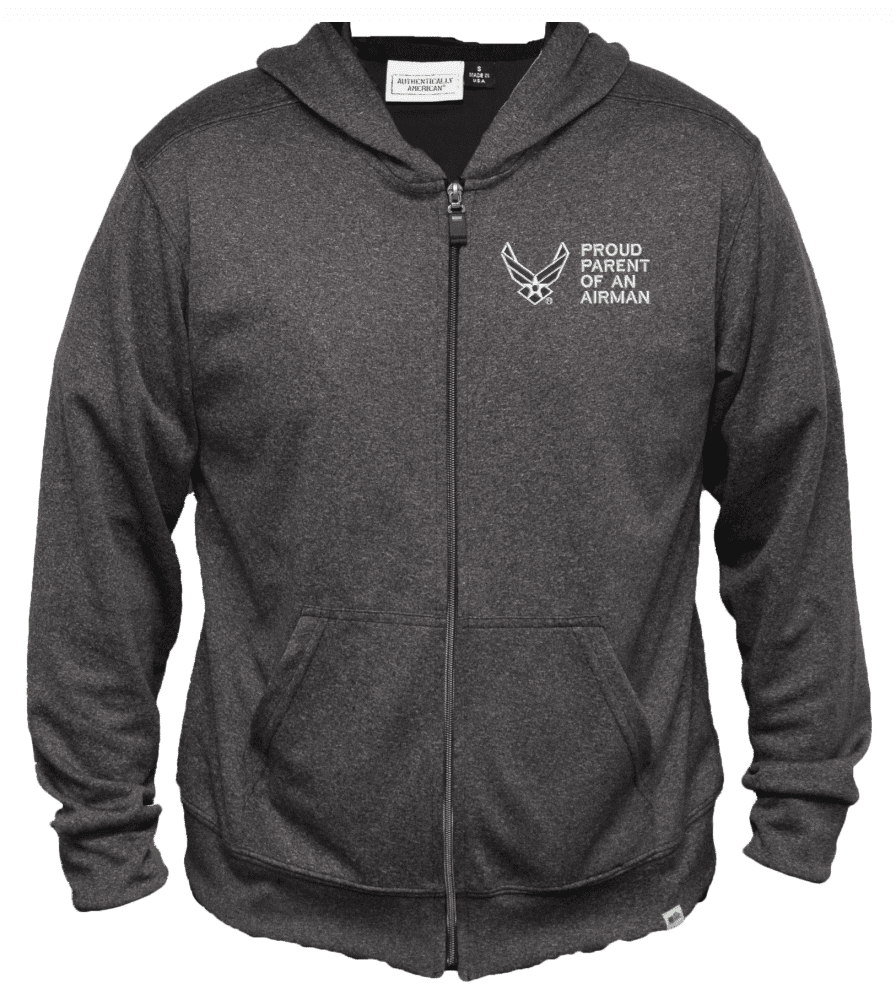 MilitaryBest proudly offers this top-quality Proud Parent of an Airman U.S. Air Force Men's 100% Polyester Heather Grey Full-Zip Hoodie. We have proudly partnered with Authentically American to offer you this Made in the USA Hoodie. Water & wrinkle resistance make this zip hoodie the perfect layering piece from the golf course to you favorite travel destination.As with all MilitaryBest items, our designs are Officially Licensed. A percentage of the sale of each MilitaryBest item is forwarded to the licensing department in support of it's MWR (Morale, Welfare, & Recreation) program. These payments are made by either ALL4U LLC or the wholesaler from where the item originated. Our team thanks you for your service and your support of these programs.