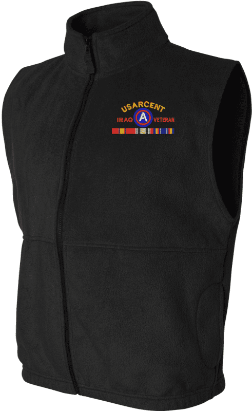 Note: Due to supply chain disruptions, some colors and sizes may not be available in the same brand, in these cases a brand of comarable quality will be used. Feel free to call in advance of your order, with questions you may have.MilitaryBest is proud to offer this quality U.S. Army United States Army Central Iraq Veteran with Ribbons Embroidered Fleece Vest. This Fleece Vest features a convertible collar with dyed-to-match zipper pull, oversized nylon reinforced slash pockets, and an elastic hem. It is made using a 100% anti-pill polyester Fleece Vest. This Fleece Vest will make an excellent addition to your wardrobe, or a quality gift. Your satisfaction is guaranteed! These quality fleece vests are proudly embroidered at our facilities in Scottsboro, AL. Support the Army MWR program by purchasing only from Licensed Vendors.