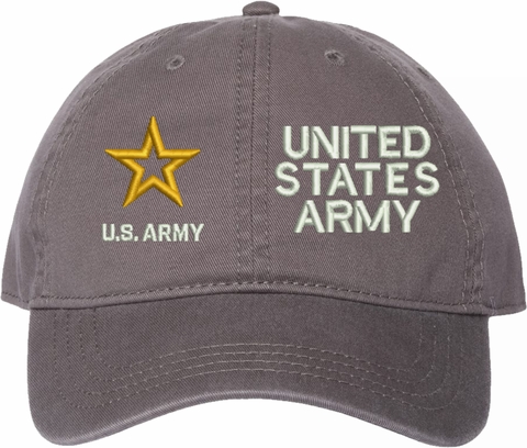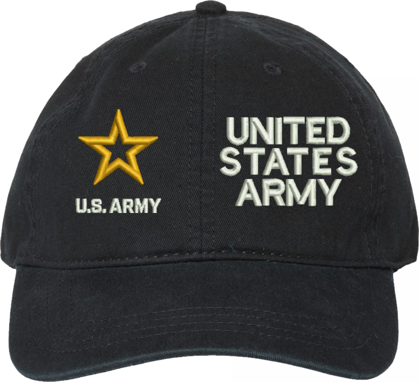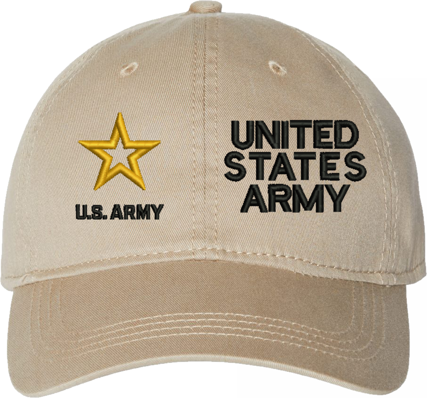 Show your Army pride with this United States Army Unstructured Dad Cap from MilitaryBest. Crafted from 100% washed chino twill cotton, this six-panel, low-profile cap offers a relaxed and comfortable fit. Featuring high-quality embroidery done in our Scottsboro, Alabama facility, this cap is designed with a pre-curved visor and an adjustable tri-glide buckle closure for a perfect fit. Whether for everyday wear or as a meaningful gift, this cap is a great way to honor your own or a loved one's service.For caps ordered with custom embroidered personalized text please allow an additional 3 to 5 days production time. All custom back text will be embroidered in ALL CAPITAL LETTERS. Caps with back text or eggs are non-returnable unless there is a material defect in the cap.