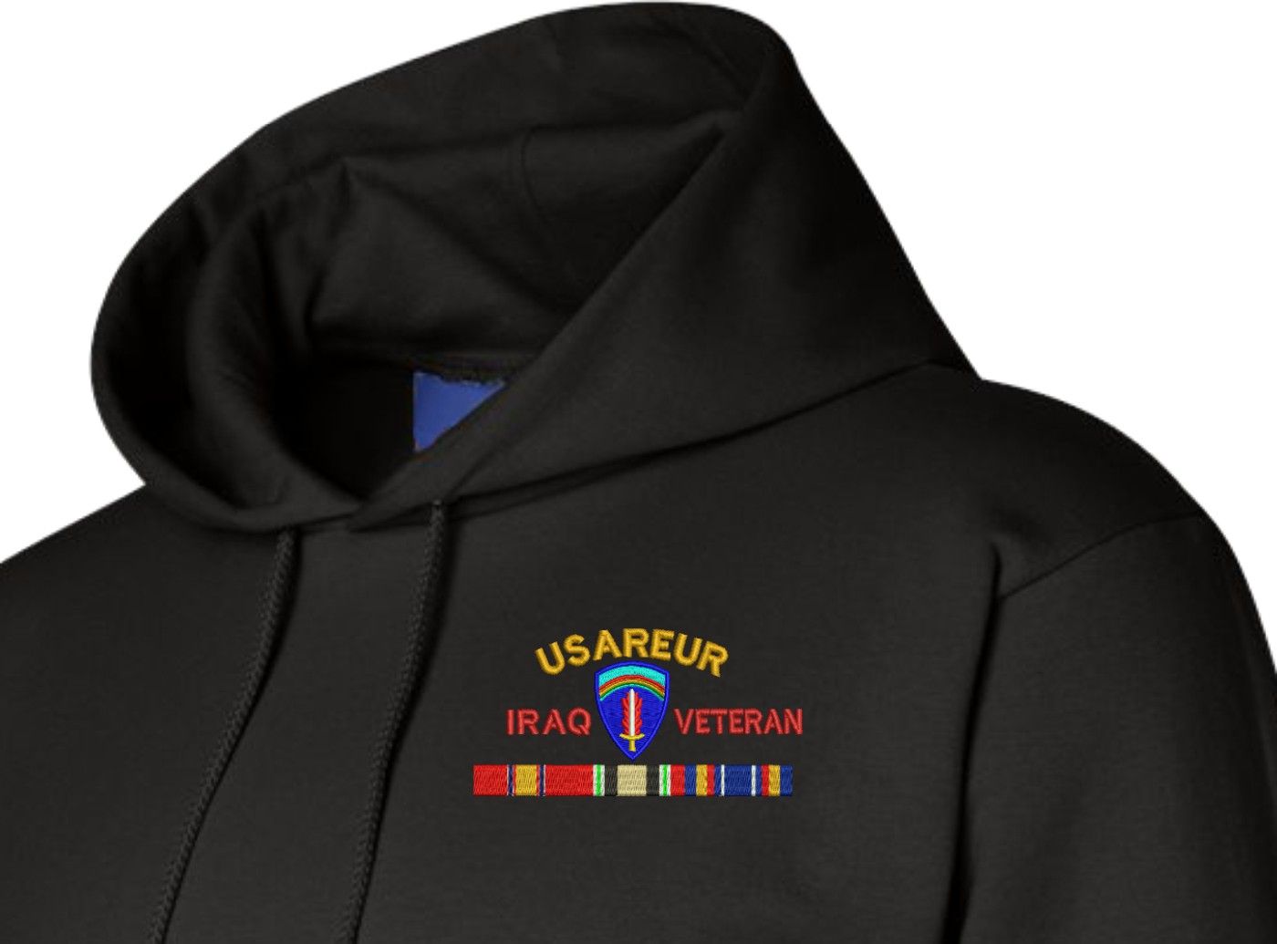 MilitaryBest has expanded its line of apparel with this custom embroidered U.S. Army United States Army Europe Iraq Veteran with Ribbons Embroidered Hoodie. Each Hoodie is direct embroidered onto a Champion brand 9.5 oz 50/50 Cotton Poly blend. This Hoodie will make an excellent addition to your wardrobe, or a great gift. Your satisfaction is Guaranteed! These quality hoodies are proudly embroidered at our facilities in Scottsboro, AL. Support the Army MWR program by purchasing only from Licensed Vendors.