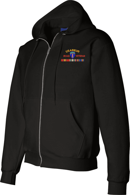 MilitaryBest has expanded its line of apparel with this custom embroidered U.S. Army United States Army Europe Iraq Veteran with Ribbons Embroidered Zippered Hoodie. Each Hoodie is direct embroidered onto a Champion brand 9.5 oz 50/50 Cotton Poly blend. This will make an excellent addition to your wardrobe, or a great gift. Your satisfaction is Guaranteed! These quality zippered hoodies are proudly embroidered at our facilities in Scottsboro, AL. Support the Army MWR program by purchasing only from Licensed Vendors.