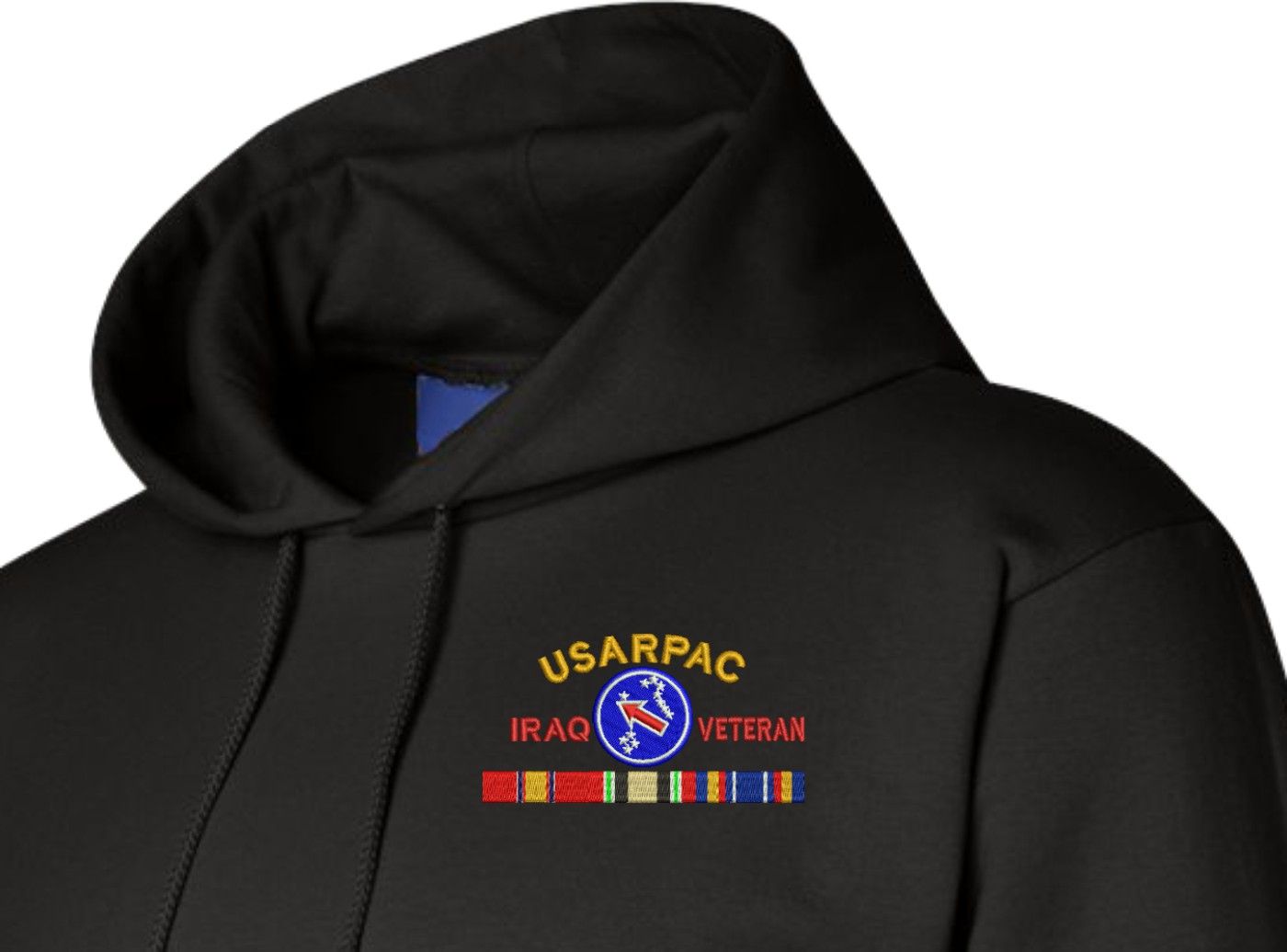 MilitaryBest has expanded its line of apparel with this custom embroidered U.S. Army United States Army Pacific Iraq Veteran with Ribbons Embroidered Hoodie. Each Hoodie is direct embroidered onto a Champion brand 9.5 oz 50/50 Cotton Poly blend. This Hoodie will make an excellent addition to your wardrobe, or a great gift. Your satisfaction is Guaranteed! These quality hoodies are proudly embroidered at our facilities in Scottsboro, AL. Support the Army MWR program by purchasing only from Licensed Vendors.