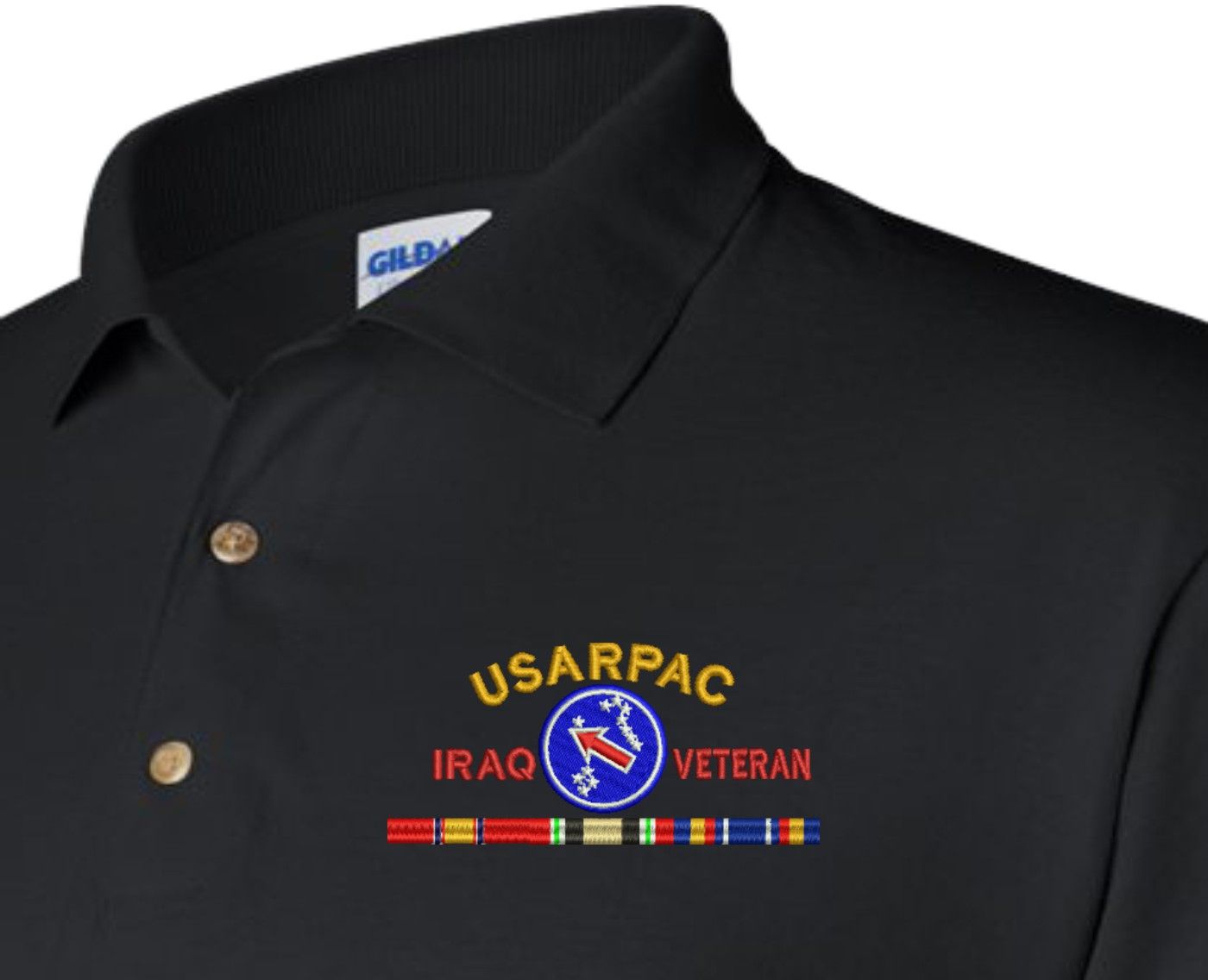 MilitaryBest is proud to offer this quality U.S. Army United States Army Pacific Iraq Veteran with Ribbons Embroidered Polo. Each Polo is available in either 100% Ringspun cotton pique or a 50/50 cotton/polyester blend. These quality Military Polos are proudly embroidered at our facilities in Scottsboro, AL. Support the Army MWR program by purchasing only from Licensed Vendors.