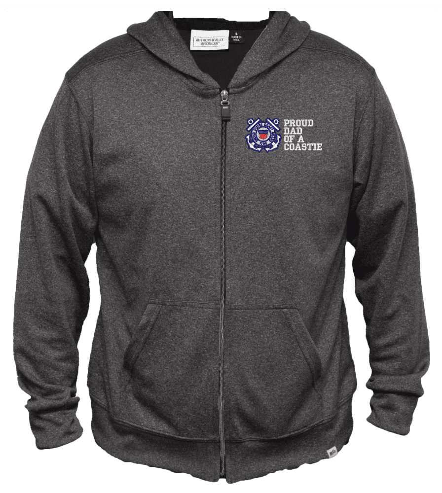 MilitaryBest proudly offers this top-quality Proud Dad of a Coastie Men's 100% Polyester Heather Grey Full-Zip Hoodie. We have proudly partnered with Authentically American to offer you this Made in the USA Hoodie. Water & wrinkle resistance make this zip hoodie the perfect layering piece from the golf course to you favorite travel destination.As with all MilitaryBest items, our designs are Officially Licensed. A percentage of the sale of each MilitaryBest item is forwarded to the licensing department in support of it's MWR (Morale, Welfare, & Recreation) program. These payments are made by either ALL4U LLC or the wholesaler from where the item originated. Our team thanks you for your service and your support of these programs.