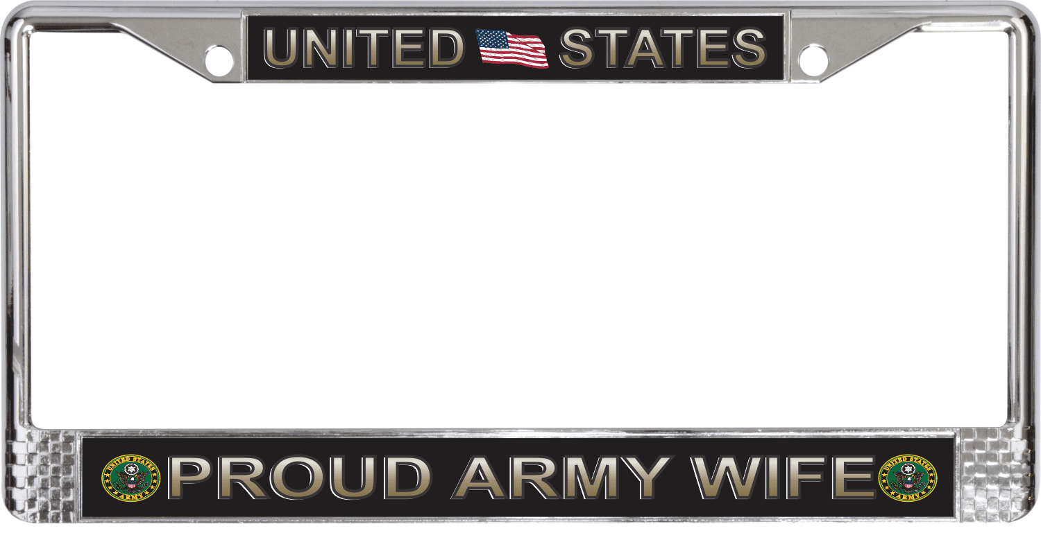 United States Proud Army Wife License Plate FrameThis United States Proud Army Wife License Plate Frame is made from the highest quality finished metal alloy. Each one is designed to provide years of use. Each is designed in our facility in Scottsboro, Alabama.