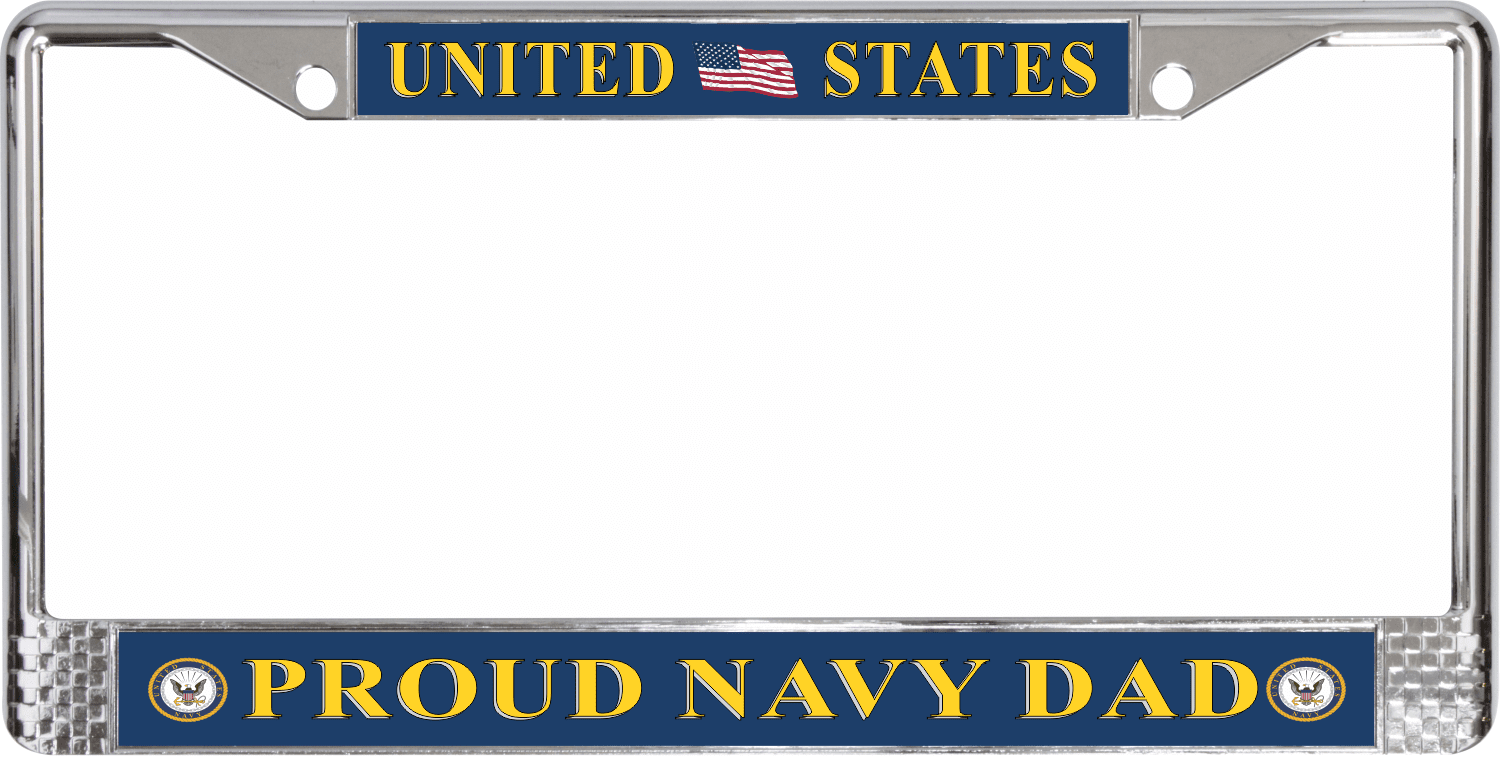 United States Proud Navy Dad License Plate FrameThis United States Proud Navy Dad License Plate Frame is made from the highest quality finished metal alloy. Each one is designed to provide years of use. Each is designed in our facility in Scottsboro, Alabama.