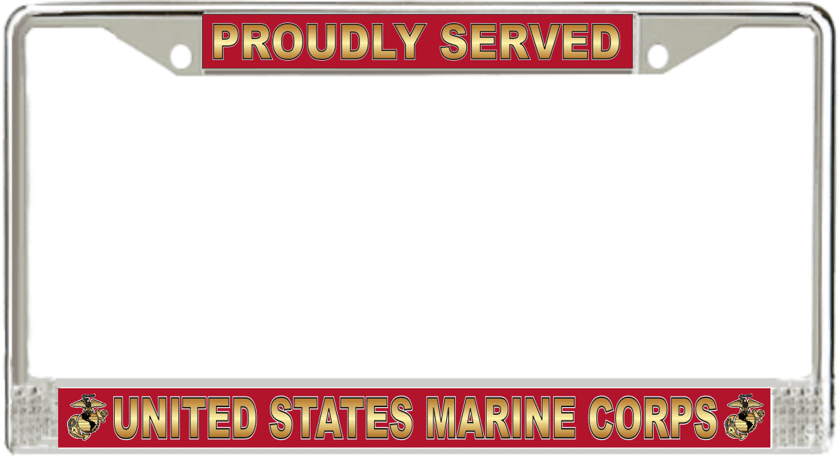 U.S.M.C. 'Proudly Served' License Plate FrameThis United States Marine Corps w / EGA 'Proudly Served' License Plate Frame is made from the highest quality gold chrome finished metal alloy. Each one is designed to provide years of use. Each is designed in our facility in Scottsboro, Alabama.