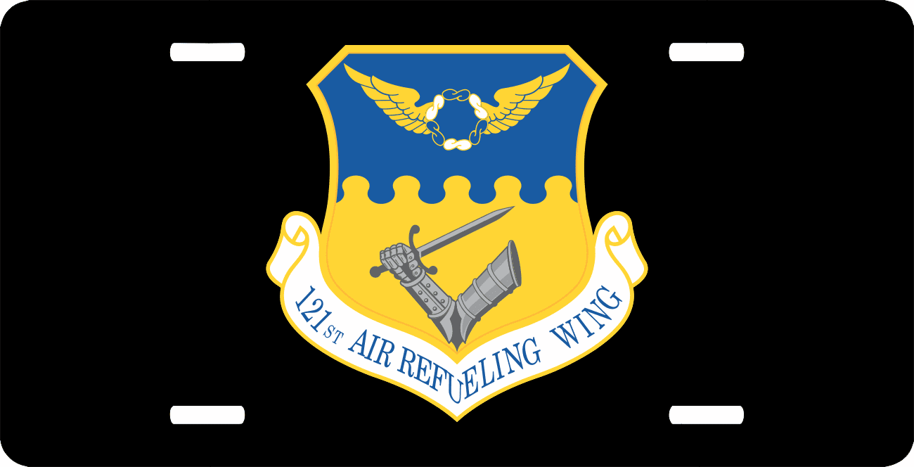 This U.S. Air Force 121st Air Refueling Wing License Plate is made from heavy gauge aluminum and has a baked enamel finish to last for many years of use. Each plate measures 5 15/16" x 11 15/16". This license plate would make a wonderful addition to your collection or a great gift.