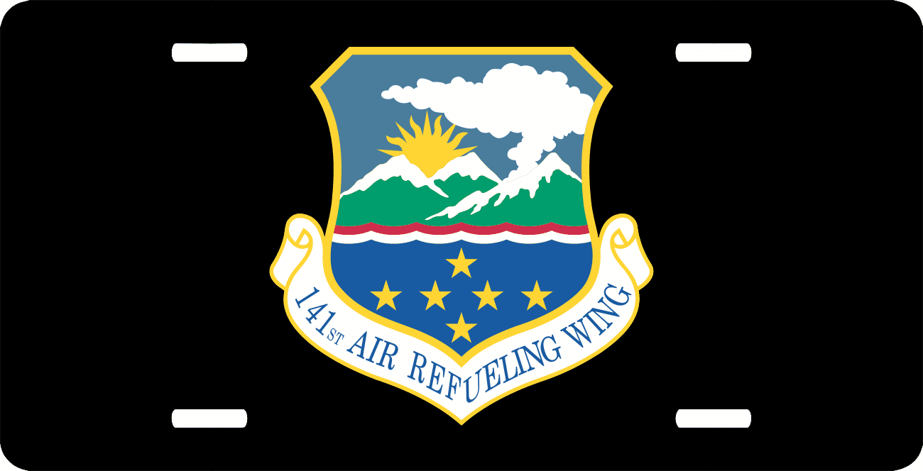 This U.S. Air Force 141st Air Refueling Wing License Plate is made from heavy gauge aluminum and has a baked enamel finish to last for many years of use. Each plate measures 5 15/16" x 11 15/16". This license plate would make a wonderful addition to your collection or a great gift.