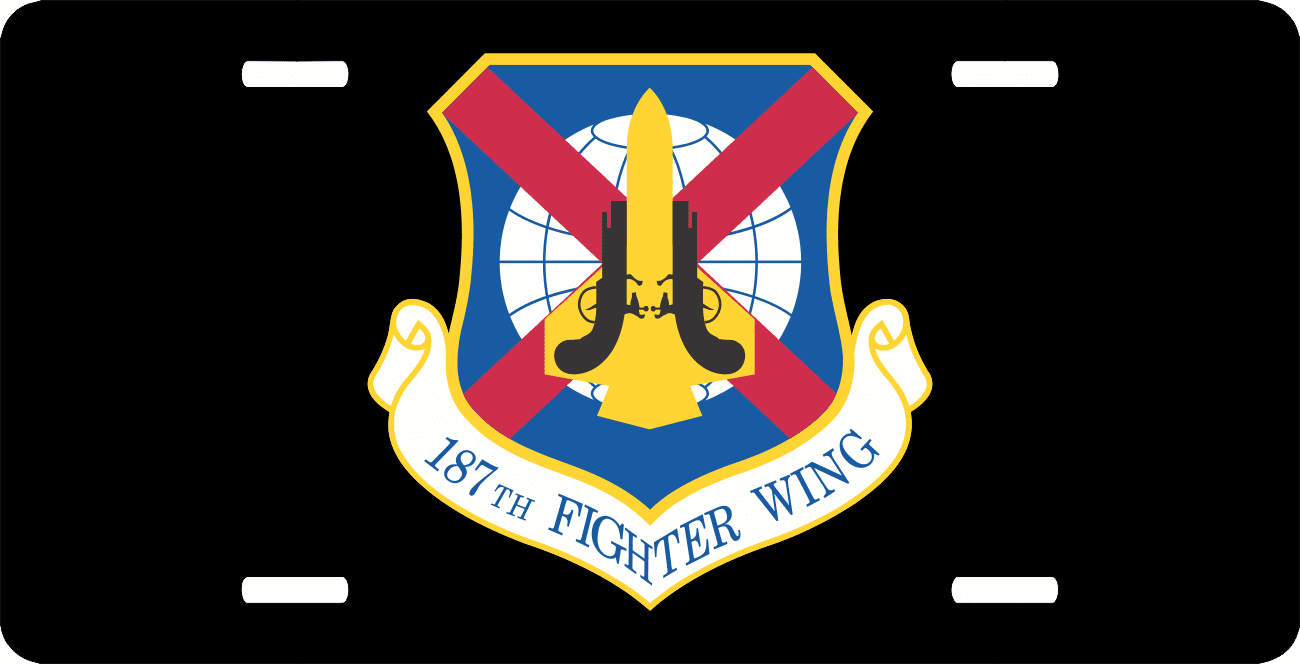 This U.S. Air Force 187th Fighter Wing License Plate is made from heavy gauge aluminum and has a baked enamel finish to last for many years of use. Each plate measures 5 15/16" x 11 15/16". This license plate would make a wonderful addition to your collection or a great gift.