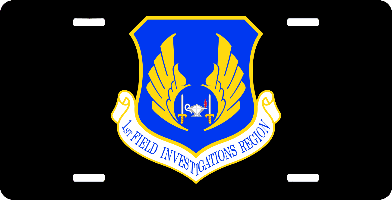 This U.S. Air Force 1st Field Investigation Region Wing License Plate is made from heavy gauge aluminum and has a baked enamel finish to last for many years of use. Each plate measures 5 15/16" x 11 15/16". This license plate would make a wonderful addition to your collection or a great gift.