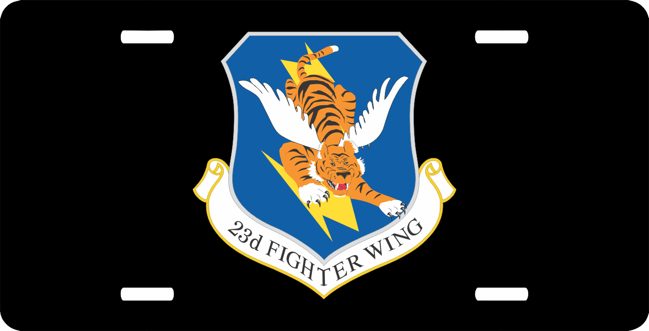 This U.S. Air Force 23rd Fighter Wing License Plate is made from heavy gauge aluminum and has a baked enamel finish to last for many years of use. Each plate measures 5 15/16" x 11 15/16". This license plate would make a wonderful addition to your collection or a great gift.