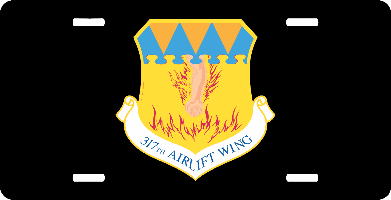 This U.S. Air Force 317th Airlift Wing License Plate is made from heavy gauge aluminum and has a baked enamel finish to last for many years of use. Each plate measures 5 15/16" x 11 15/16". This license plate would make a wonderful addition to your collection or a great gift.