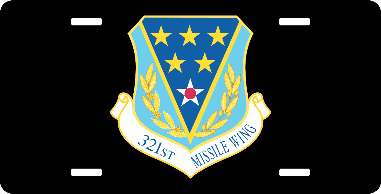 This U.S. Air Force 321st Missile Wing License Plate is made from heavy gauge aluminum and has a baked enamel finish to last for many years of use. Each plate measures 5 15/16" x 11 15/16". This license plate would make a wonderful addition to your collection or a great gift.
