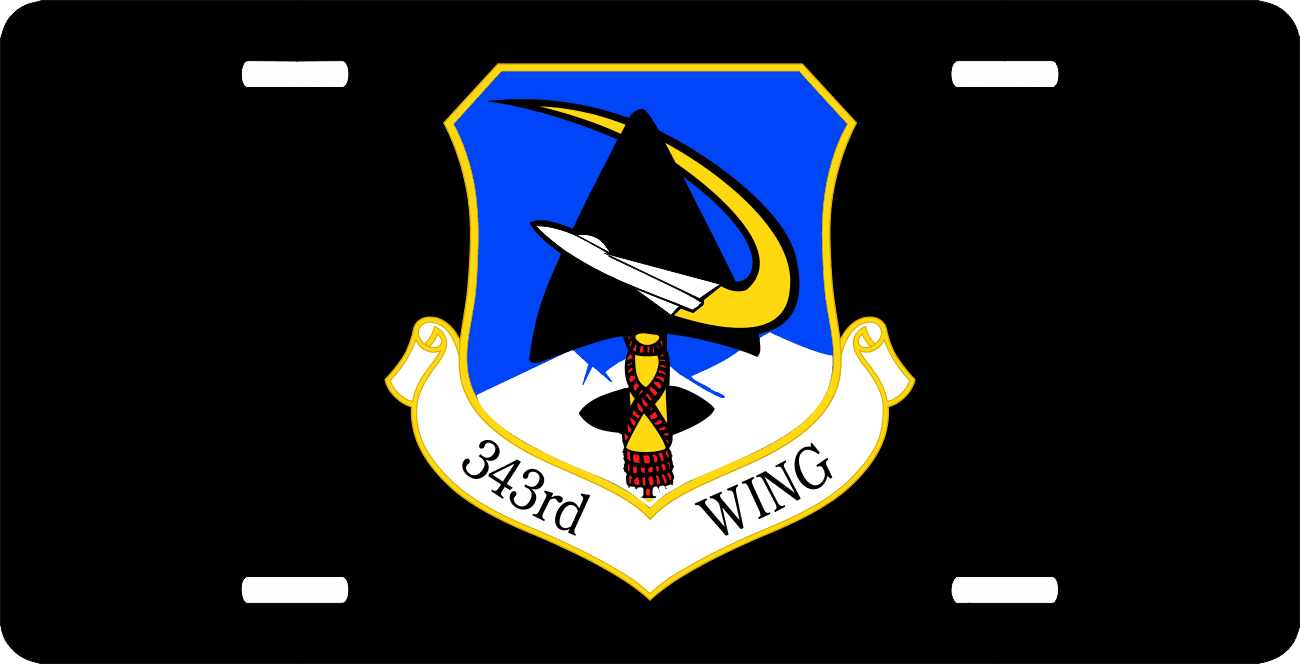 This U.S. Air Force 343rd Wing License Plate is made from heavy gauge aluminum and has a baked enamel finish to last for many years of use. Each plate measures 5 15/16" x 11 15/16". This license plate would make a wonderful addition to your collection or a great gift.