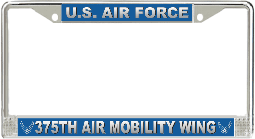 U.S. Air Force 375th Air Mobility Wing License Plate FrameThis U.S. Air Force 375th Air Mobility Wing License Plate Frame is made from the highest quality finished metal alloy. Each one is designed to provide years of use. Each is designed in our facility in Scottsboro, Alabama. Please check your state and local regulations for compatibility of these frames for use on your vehicle.