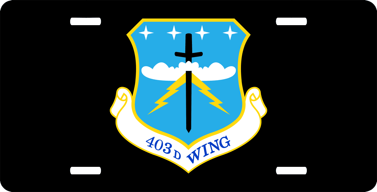 This U.S. Air Force 403rd Wing License Plate is made from heavy gauge aluminum and has a baked enamel finish to last for many years of use. Each plate measures 5 15/16" x 11 15/16". This license plate would make a wonderful addition to your collection or a great gift.