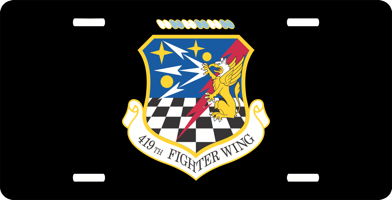 This U.S. Air Force 419th Fighter Wing License Plate is made from heavy gauge aluminum and has a baked enamel finish to last for many years of use. Each plate measures 5 15/16" x 11 15/16". This license plate would make a wonderful addition to your collection or a great gift.