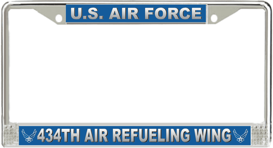 U.S. Air Force 434th Air Refueling Wing License Plate FrameThis U.S. Air Force 434th Air Refueling Wing License Plate Frame is made from the highest quality finished metal alloy. Each one is designed to provide years of use. Each is designed in our facility in Scottsboro, Alabama. Please check your state and local regulations for compatibility of these frames for use on your vehicle.