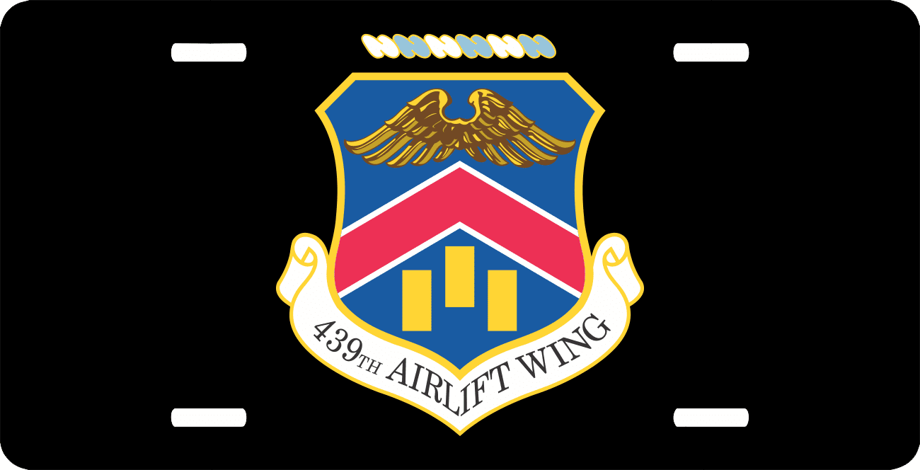This U.S. Air Force 439th Airlift Wing License Plate is made from heavy gauge aluminum and has a baked enamel finish to last for many years of use. Each plate measures 5 15/16" x 11 15/16". This license plate would make a wonderful addition to your collection or a great gift.