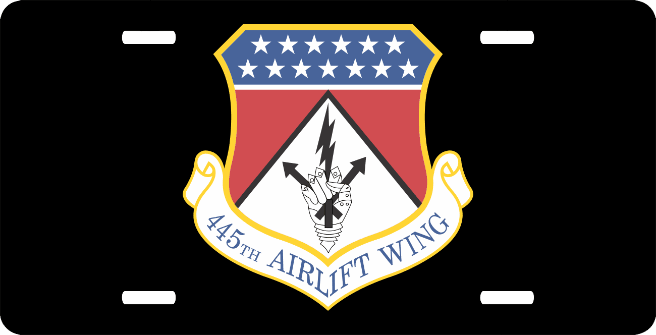 This U.S. Air Force 445th Airlift Wing License Plate is made from heavy gauge aluminum and has a baked enamel finish to last for many years of use. Each plate measures 5 15/16" x 11 15/16". This license plate would make a wonderful addition to your collection or a great gift.