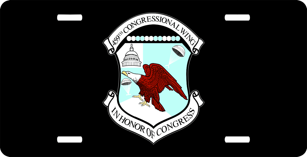 This U.S. Air Force 459th Congressional Wing License Plate is made from heavy gauge aluminum and has a baked enamel finish to last for many years of use. Each plate measures 5 15/16" x 11 15/16". This license plate would make a wonderful addition to your collection or a great gift.