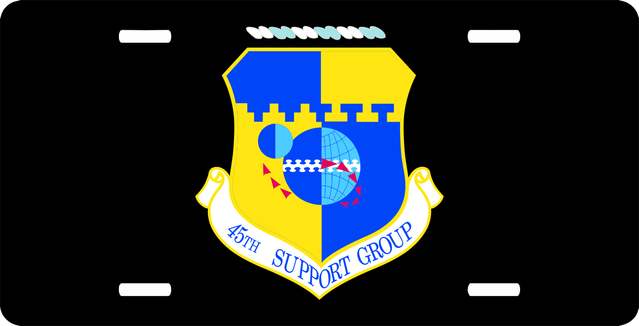 This U.S. Air Force 45th Support Group License Plate is made from heavy gauge aluminum and has a baked enamel finish to last for many years of use. Each plate measures 5 15/16" x 11 15/16". This license plate would make a wonderful addition to your collection or a great gift.