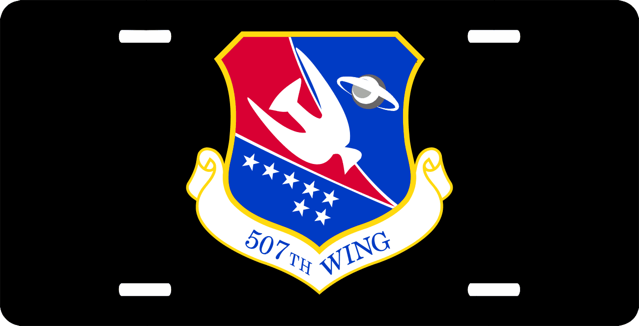 This U.S. Air Force 507th Wing License Plate is made from heavy gauge aluminum and has a baked enamel finish to last for many years of use. Each plate measures 5 15/16" x 11 15/16". This license plate would make a wonderful addition to your collection or a great gift.