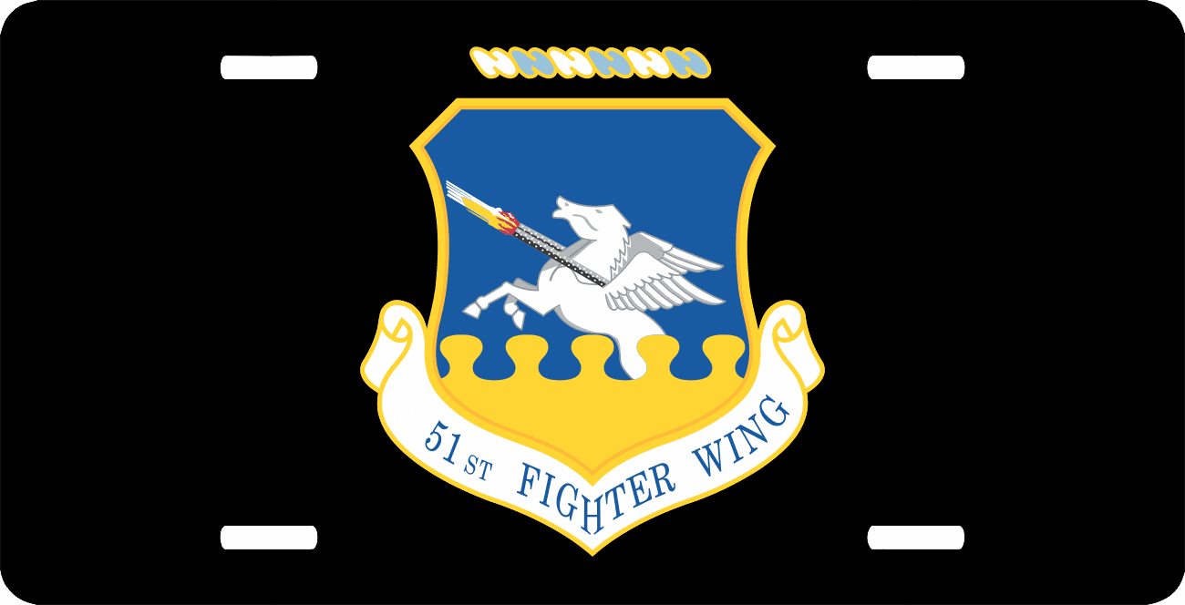 This U.S. Air Force 51st Fighter Wing License Plate is made from heavy gauge aluminum and has a baked enamel finish to last for many years of use. Each plate measures 5 15/16" x 11 15/16". This license plate would make a wonderful addition to your collection or a great gift.