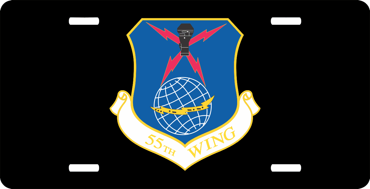 This U.S. Air Force 55th Wing License Plate is made from heavy gauge aluminum and has a baked enamel finish to last for many years of use. Each plate measures 5 15/16" x 11 15/16". This license plate would make a wonderful addition to your collection or a great gift.