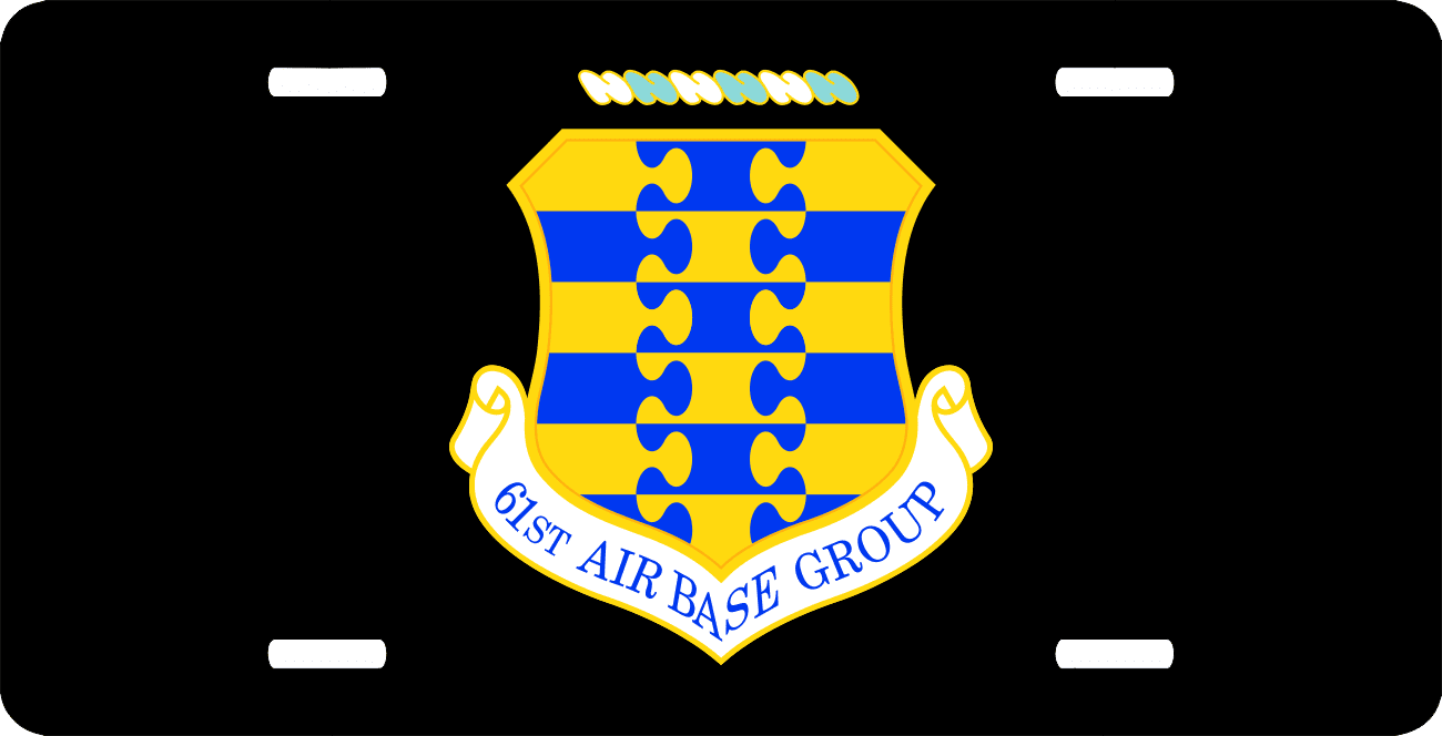 This U.S. Air Force 61st Air Base Group License Plate is made from heavy gauge aluminum and has a baked enamel finish to last for many years of use. Each plate measures 5 15/16" x 11 15/16". This license plate would make a wonderful addition to your collection or a great gift.