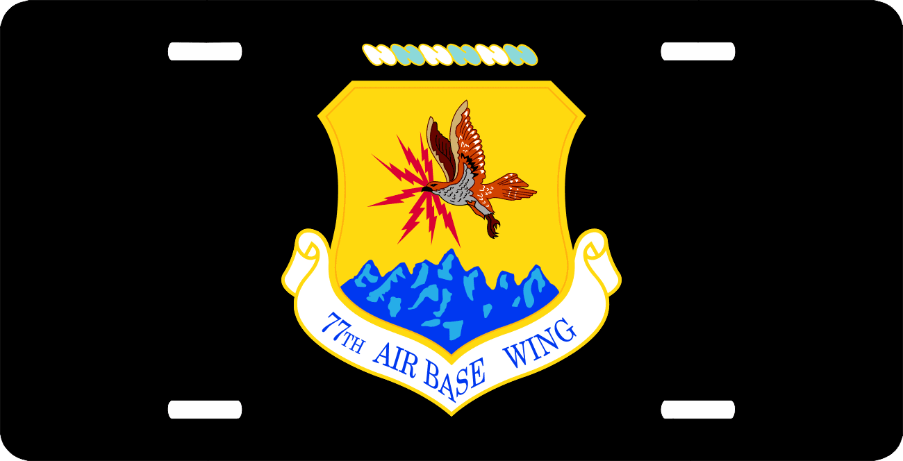 This U.S. Air Force 77th Air Base Wing License Plate is made from heavy gauge aluminum and has a baked enamel finish to last for many years of use. Each plate measures 5 15/16" x 11 15/16". This license plate would make a wonderful addition to your collection or a great gift.