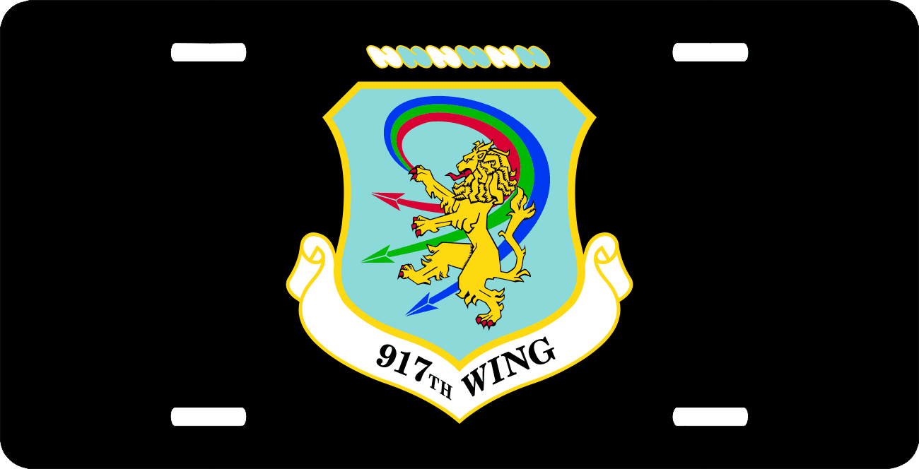 This U.S. Air Force 917th Wing License Plate is made from heavy gauge aluminum and has a baked enamel finish to last for many years of use. Each plate measures 5 15/16" x 11 15/16". This license plate would make a wonderful addition to your collection or a great gift.