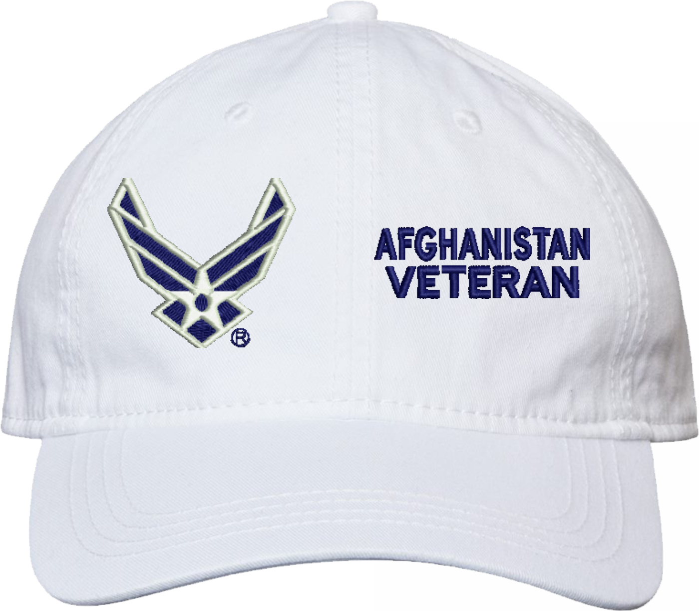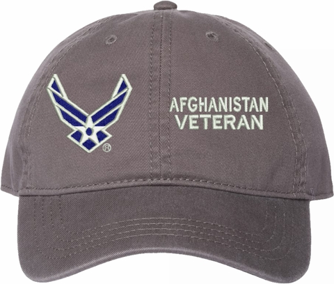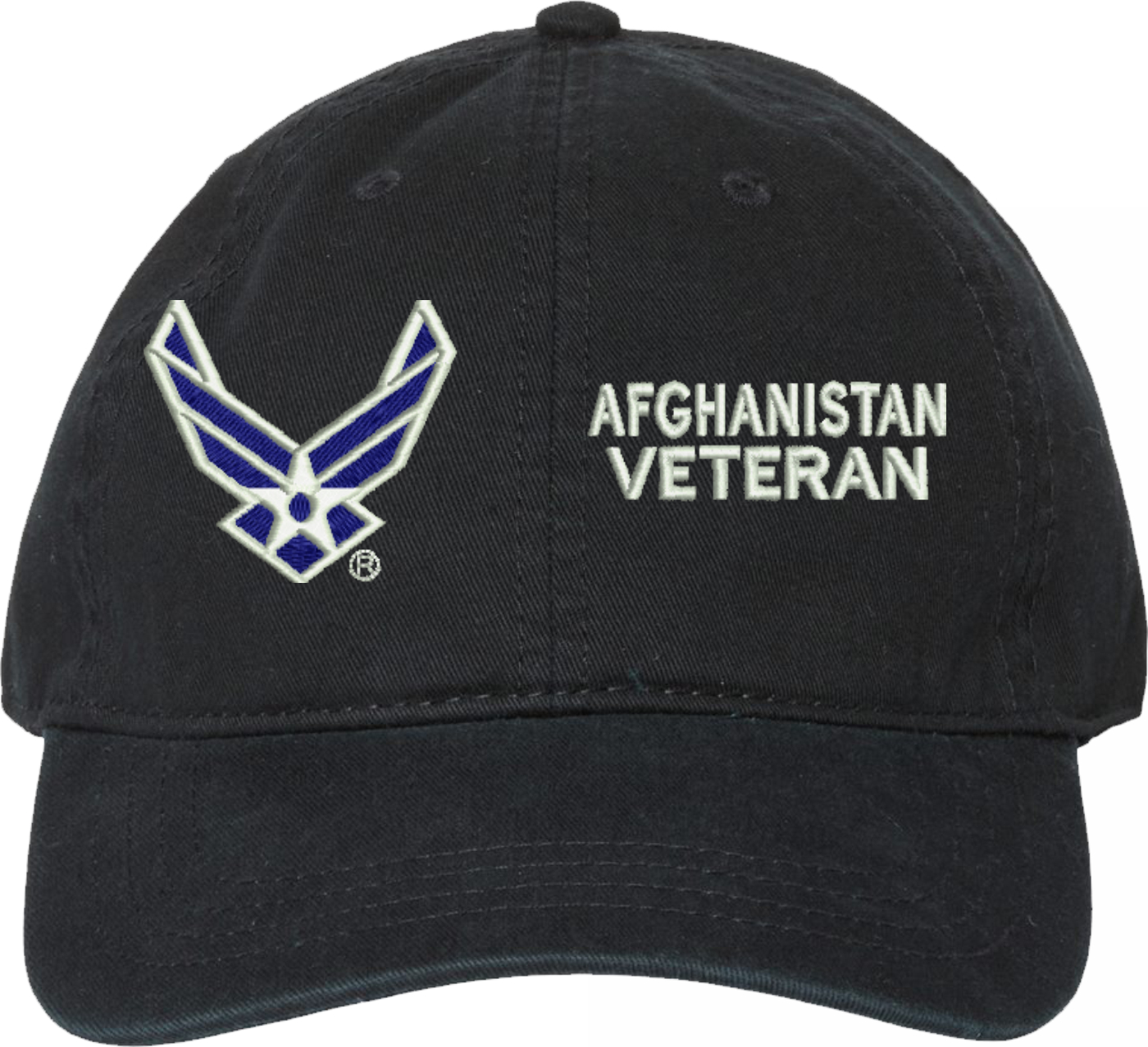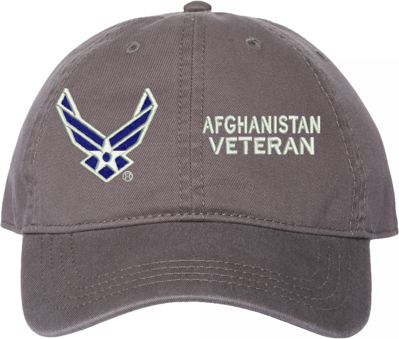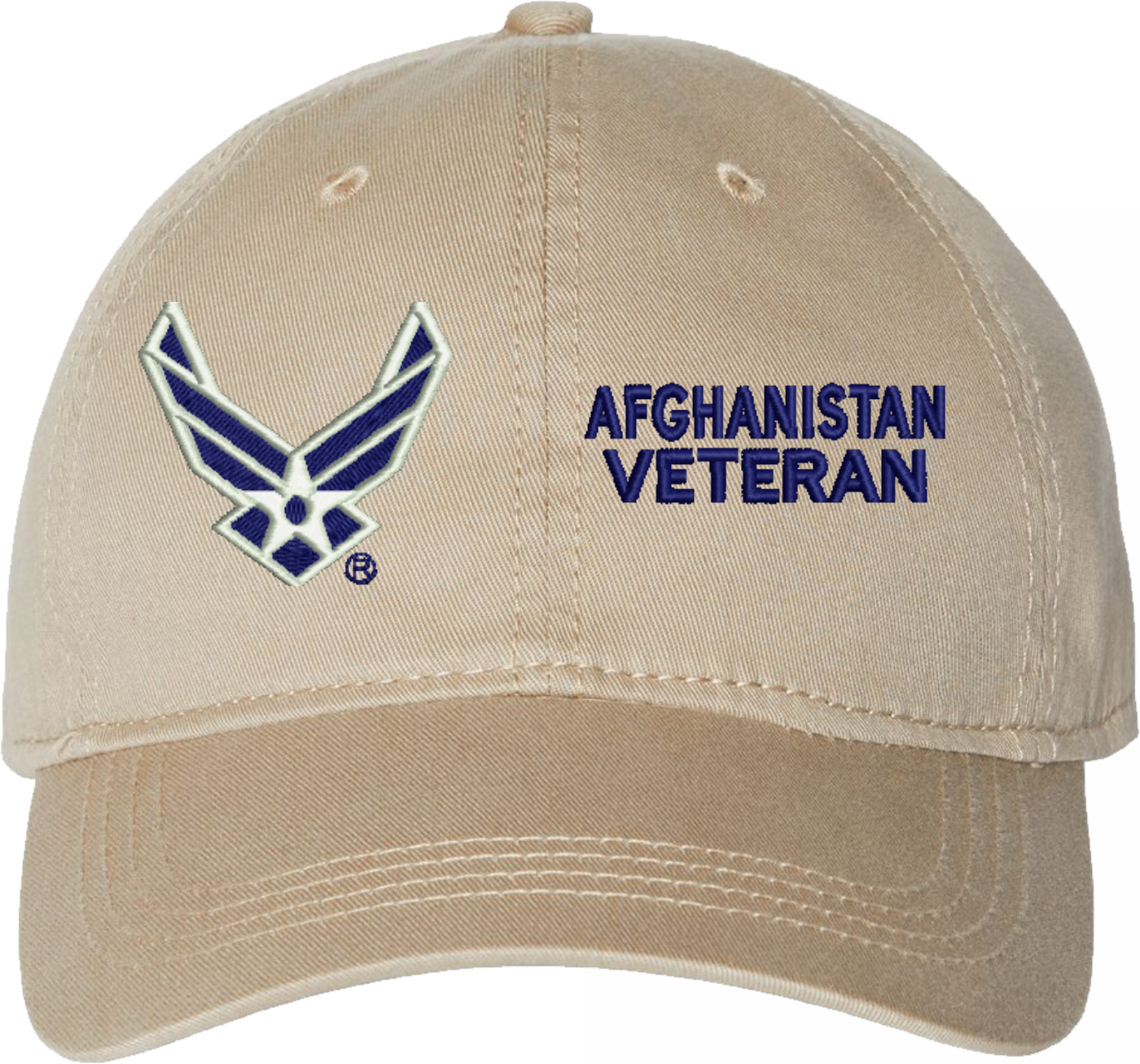 Show your Air Force pride with this U.S. Air Force Afghanistan Veteran Unstructured Dad Cap from MilitaryBest. Crafted from 100% washed chino twill cotton, this six-panel, low-profile cap offers a relaxed and comfortable fit. Featuring high-quality embroidery done in our Scottsboro, Alabama facility, this cap is designed with a pre-curved visor and an adjustable tri-glide buckle closure for a perfect fit. Whether for everyday wear or as a meaningful gift, this cap is a great way to honor your own or a loved one's service.For caps ordered with custom embroidered personalized text please allow an additional 3 to 5 days production time. All custom back text will be embroidered in ALL CAPITAL LETTERS. Caps with back text or eggs are non-returnable unless there is a material defect in the cap.