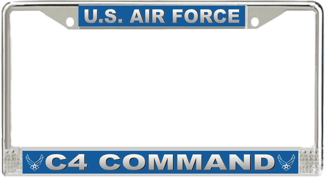 U.S. Air Force C4 Command License Plate FrameThis U.S. Air Force C4 Command License Plate Frame is made from the highest quality finished metal alloy. Each one is designed to provide years of use. Each is designed in our facility in Scottsboro, Alabama.