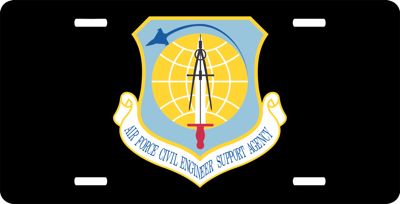 This U.S. Air Force Civil Engineer Support Agency License Plate is made from heavy gauge aluminum and has a baked enamel finish to last for many years of use. Each plate measures 5 15/16" x 11 15/16". This license plate would make a wonderful addition to your collection or a great gift.