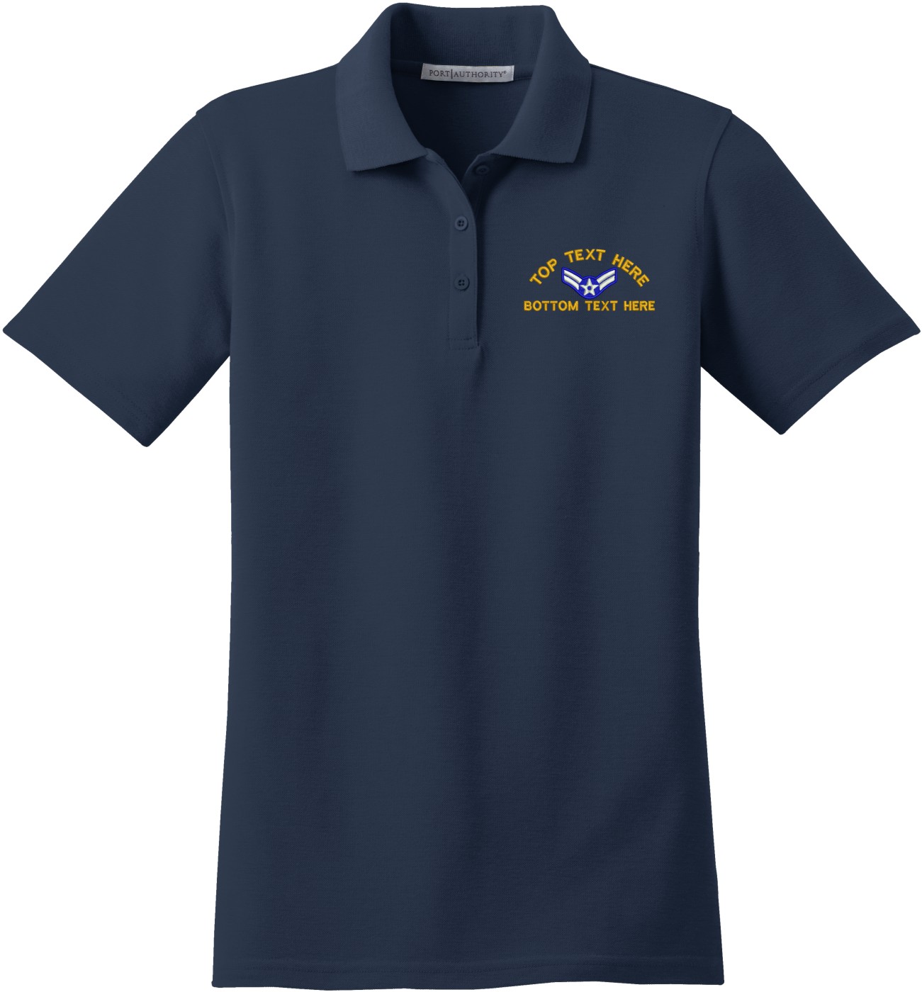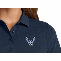 MilitaryBest is proud to offer this U.S. Air Force Custom Women's Stain-Release Polo. This polo is embroidered by our MilitaryBest team in Northeast Alabama. These polos are made with a stain-release finish for long-lasting wear, odor-fighting properties, and superior wrinkle and shrink resistance.