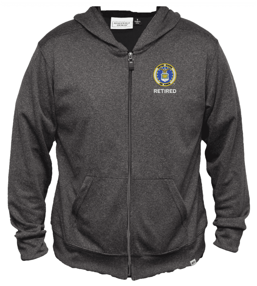 MilitaryBest proudly offers this top-quality U.S. Air Force Retired Men's 100% Polyester Heather Grey Full-Zip Hoodie. We have proudly partnered with Authentically American to offer you this Made in the USA Hoodie. Water & wrinkle resistance make this zip hoodie the perfect layering piece from the golf course to you favorite travel destination.As with all MilitaryBest items, our designs are Officially Licensed. A percentage of the sale of each MilitaryBest item is forwarded to the licensing department in support of it's MWR (Morale, Welfare, & Recreation) program. These payments are made by either ALL4U LLC or the wholesaler from where the item originated. Our team thanks you for your service and your support of these programs.