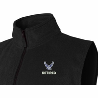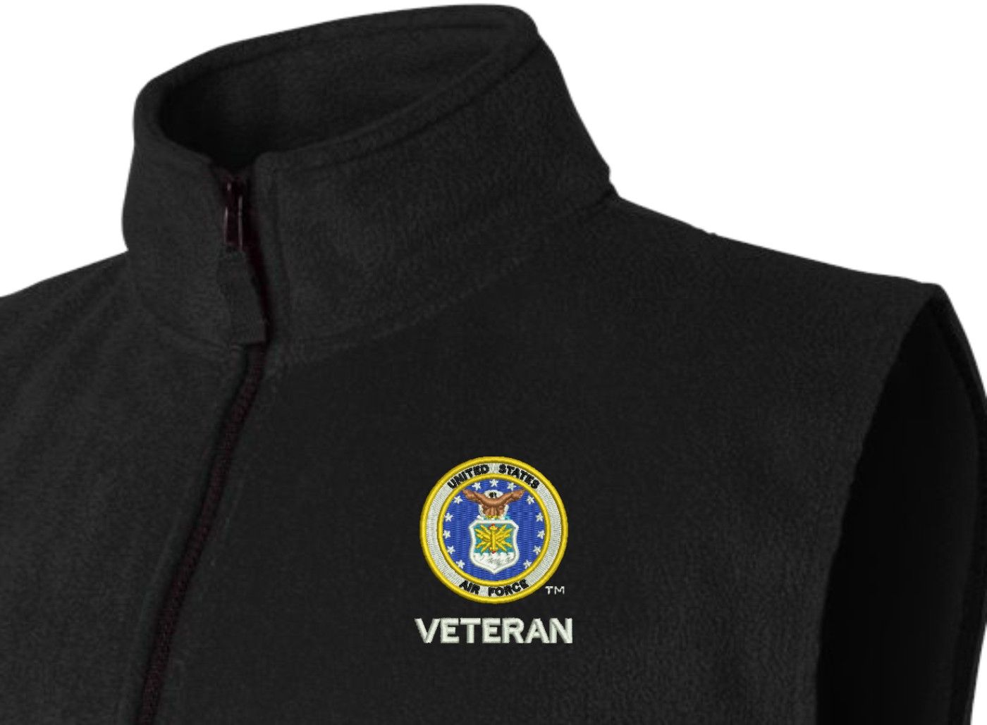 Due to supply chain disruptions, some colors and sizes may not be available in the same Brand, in these cases a brand of comparable quality will be used. Feel free to call in advance of your order, with questions you may have.MilitaryBest is expanding its line of Men's apparel with this quality U.S. Air Force Veteran Full-Zip Fleece Vest. This U.S. Air Force Veteran Full-Zip Fleece Vest features a convertible collar with dyed-to-match zipper pull, oversized nylon reinforced slash pockets, and an elastic hem. It is made using a 100% anti-pill polyester Fleece Vest. This U.S. Air Force Veteran Full-Zip Fleece Vest will make an excellent addition to your wardrobe, or a quality gift. Your satisfaction is guaranteed! These Vests are custom embroidered at our facilities in Scottsboro, AL.