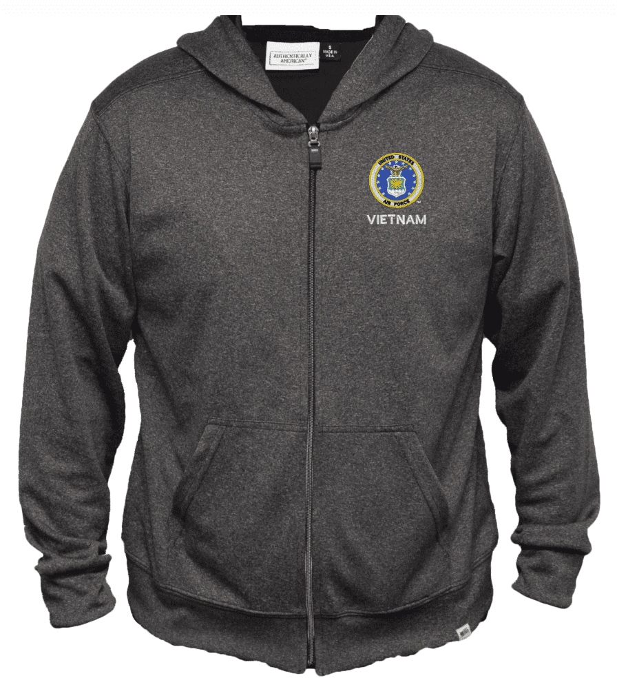 MilitaryBest proudly offers this top-quality U.S. Air Force Vietnam Men's 100% Polyester Heather Grey Full-Zip Hoodie. We have proudly partnered with Authentically American to offer you this Made in the USA Hoodie. Water & wrinkle resistance make this zip hoodie the perfect layering piece from the golf course to you favorite travel destination.As with all MilitaryBest items, our designs are Officially Licensed. A percentage of the sale of each MilitaryBest item is forwarded to the licensing department in support of it's MWR (Morale, Welfare, & Recreation) program. These payments are made by either ALL4U LLC or the wholesaler from where the item originated. Our team thanks you for your service and your support of these programs.
