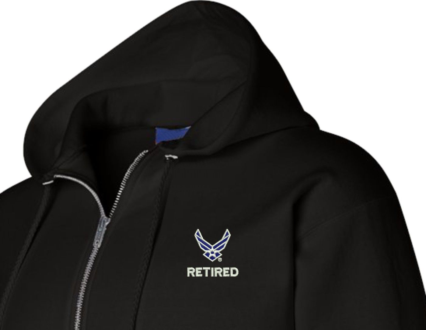 MilitaryBest has expanded its line of apparel with this custom embroidered U.S. Air Force Hap Arnold Wings Retired Zippered Hoodie. Each Hoodie is direct embroidered onto a Champion brand 9.5 oz 50/50 Cotton Poly blend. This U.S. Air Force Hap Arnold Wings Retired Zippered Hoodie will make an excellent addition to your wardrobe, or a great gift. Your satisfaction is Guaranteed! This U.S. Air Force Hap Arnold Wings Retired Zippered Hoodie is custom embroidered at our facilities in Scottsboro, AL.