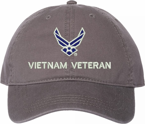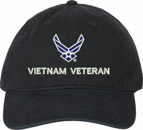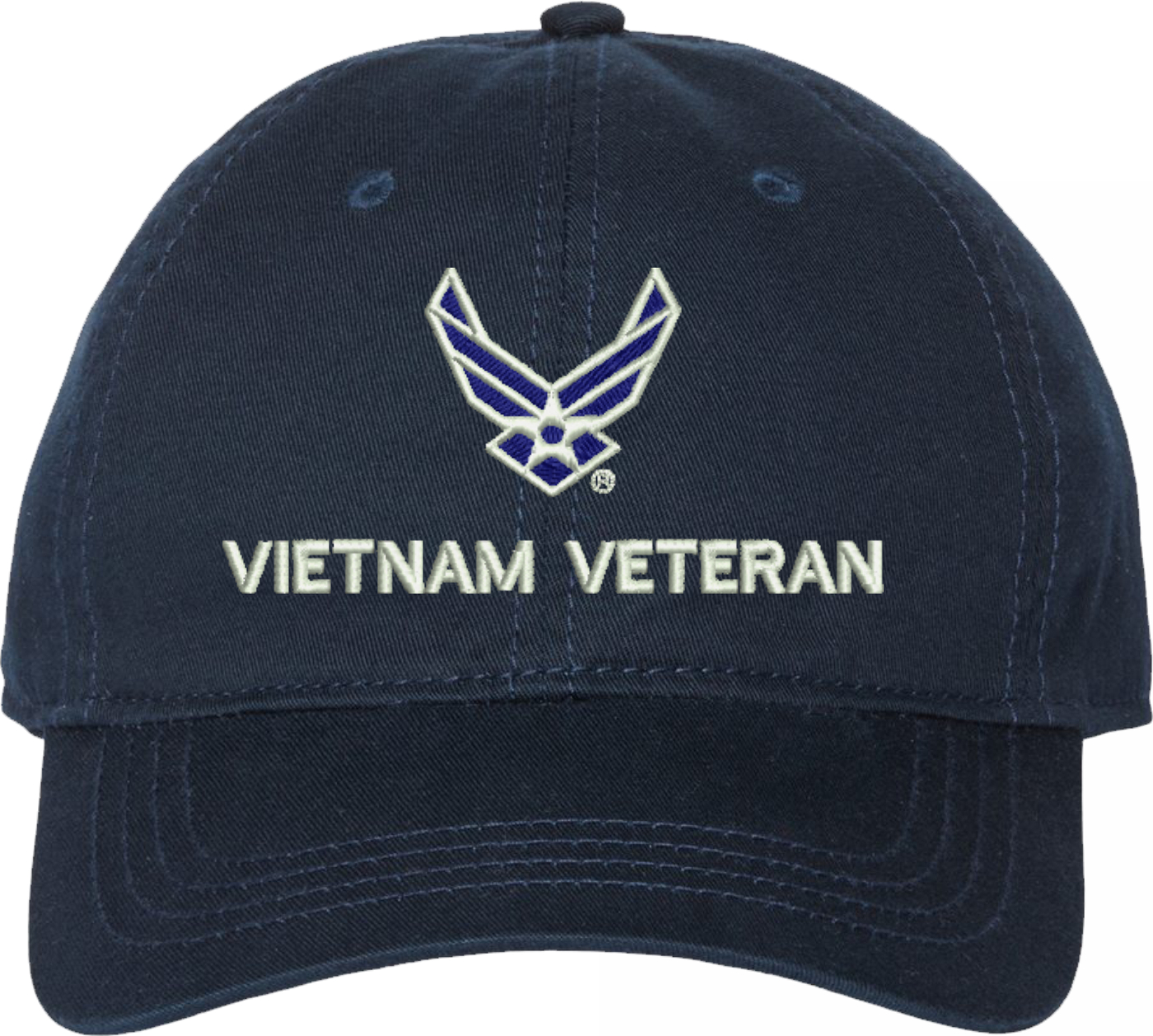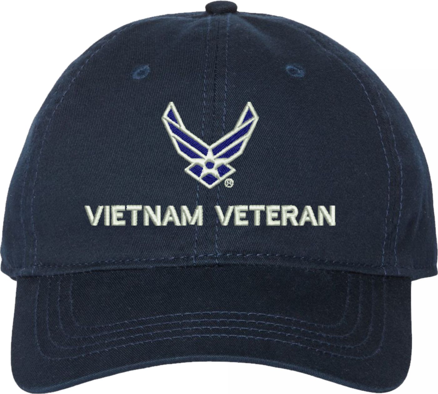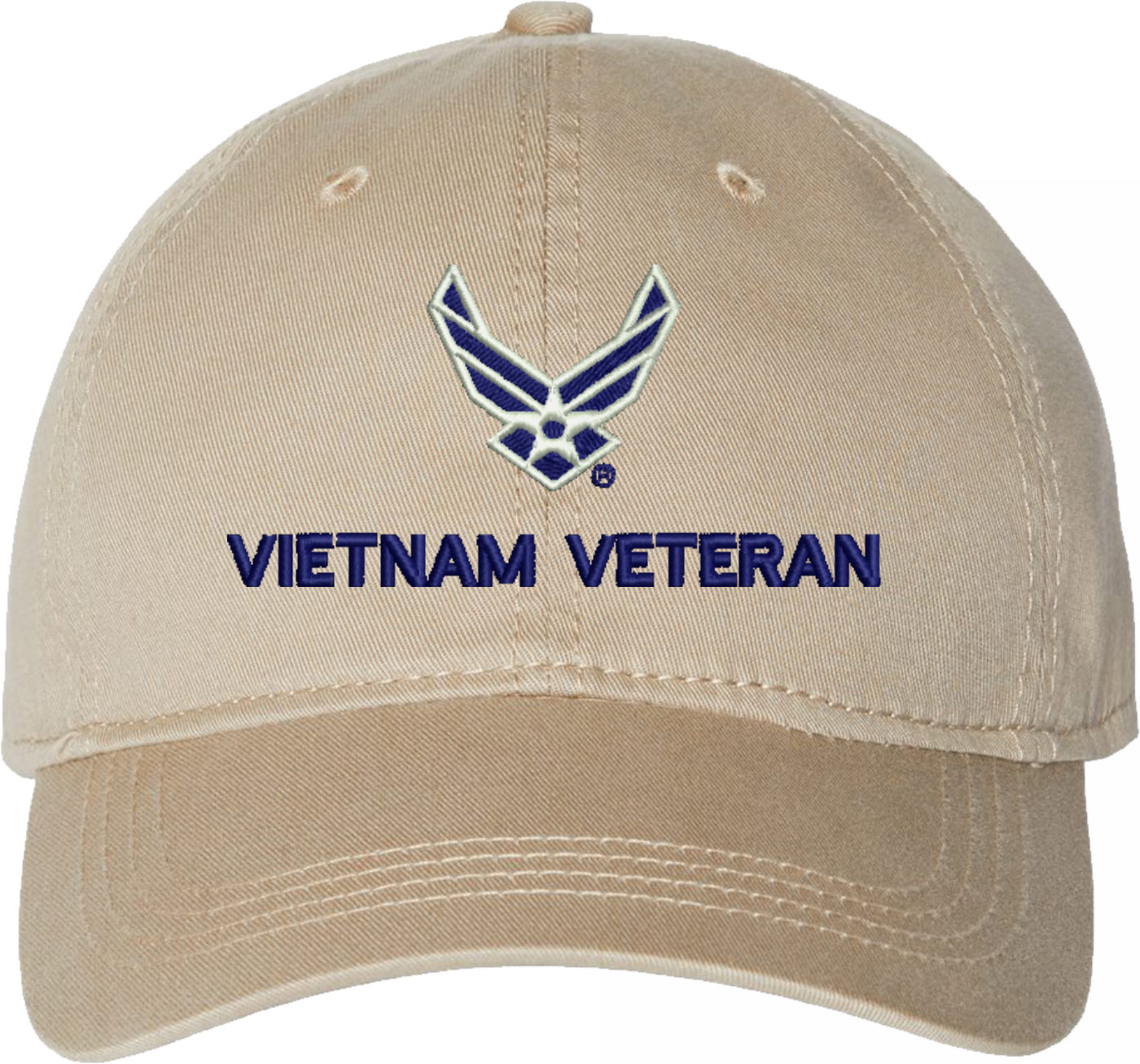Show your Air Force pride with this U.S. Air Force HAP Wings Vietnam Veteran Unstructured Dad Cap from MilitaryBest. Crafted from 100% washed chino twill cotton, this six-panel, low-profile cap offers a relaxed and comfortable fit. Featuring high-quality embroidery done in our Scottsboro, Alabama facility, this cap is designed with a pre-curved visor and an adjustable tri-glide buckle closure for a perfect fit. Whether for everyday wear or as a meaningful gift, this cap is a great way to honor your own or a loved one's service.For caps ordered with custom embroidered personalized text please allow an additional 3 to 5 days production time. All custom back text will be embroidered in ALL CAPITAL LETTERS. Caps with back text or eggs are non-returnable unless there is a material defect in the cap.